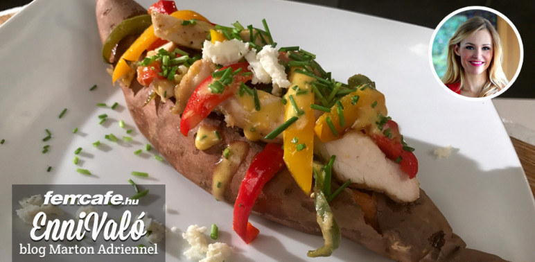 A következő receptem édesburgonya hajó, amit színes ropogós zöldségekkel és sült-sajtos csirkével töltöttem meg.