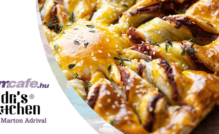 Rátesszük a másik leveles tésztát, kicsit megnyomkodjuk a széleit, majd bevagdossuk úgy, hogy a kör közepe egyben maradjon.