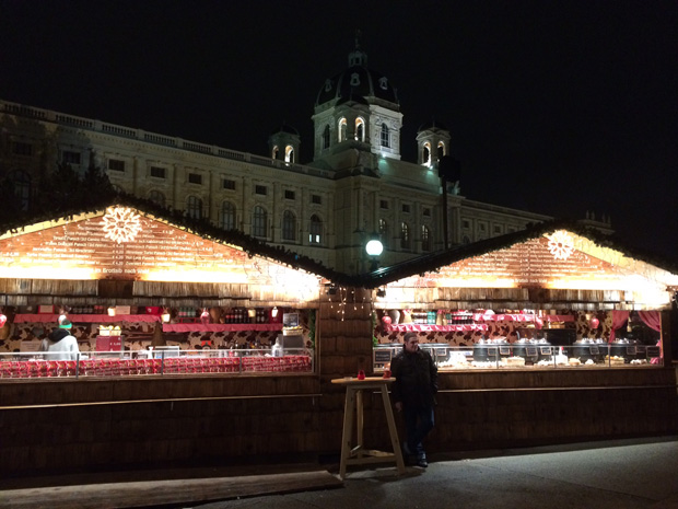 A Kunsthistorisches és a Naturhistorisches Museum között (U2 Museumsquartier, U2/U3 Volkstheater), Mária Terézia császárnő szoknyája alatt a Weihnachtsdorf, azaz Karácsonyi falu vár bennünket.