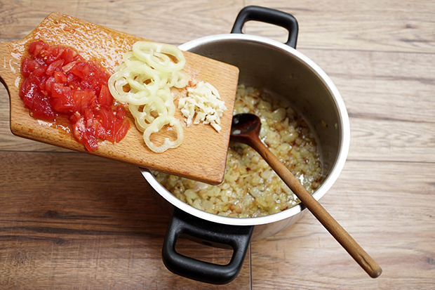 Egy nagyobb serpenyőben megolvasztjuk a sertészsírt és beletesszük az apróra vágott vöröshagymát, fokhagymát. Üvegesre pároljuk.