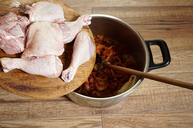 A kettőbe vágott csirkecombokat beletesszük az alapba. Hozzá tesszük a fél zellergumót. Alaposan összekeverjük. Felöntjük annyi vízzel, hogy majdnem ellepje a csirkecombokat. Sózzuk, borsozzuk, lefedve főzzük 50 percen keresztül alacsony hőfokon.