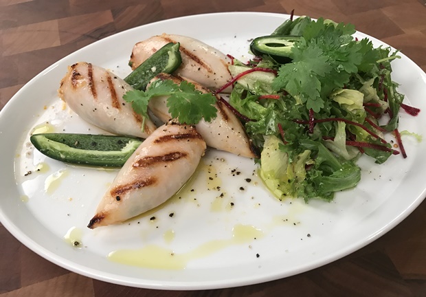 3. A tintahalakat megtöltjük, meglocsoljuk olívaolajjal, majd grill serpenyőn megsütjük.