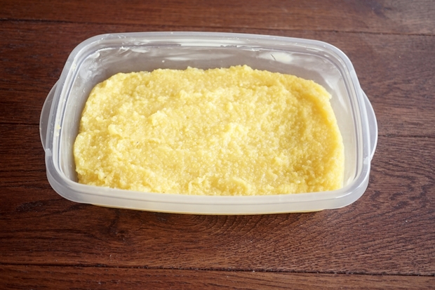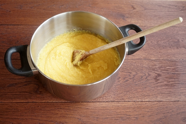 1. A vizet, a sóval és egy evőkanálnyi kukoricadarával felforraljuk (ezzel megelőzhető a csomósodás). Mérsékeljük a lángot és a többi kukoricadarát lassan beleöntjük a gyöngyöző vízbe. 35-40 percig főzzük, folyamatos kevergetés mellett. Ahogy sűrűsödik a polenta, egyre nehezebb keverni. Ha kész, levesszük a tűzről. Végül belekeverjük a vajat, majd a reszelt parmezánt is. Ízlés szerint sózzuk.