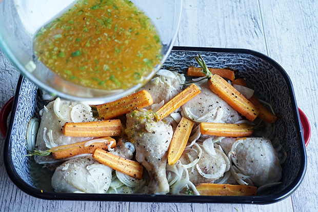 Melegítsük elő a sütőt 190 fokra. Tegyük bele egy tepsibe a csirkecombokat, a sárgarépát és hagymát, majd forgassuk össze az olajjal. Sózzuk, borsozzuk ízlés szerint és süssük 30 percig.