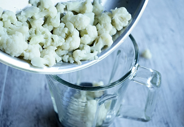 Közben tegyük a karfiolrózsákat egy serpenyőbe kb. 1 cm vízbe, fedjük le és pároljuk 10 percig. Szűrjük le róla az összes vizet és tegyük bele a turmixgépbe.
