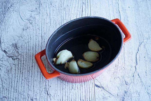 Ez idő alatt készítsük el a karfiolpürét. Melegítsük a sütőt 230 fokra. Tegyük a pucolt fokhagymagerezdeket egy hőtartó edénybe, locsoljunk rá egy kis olívaolajat. Fedjük le és süssük 15 percig.