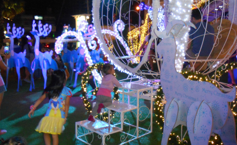 A melegben nem nagyon van karácsonyi hangulatunk, bár úgy tudom, otthon is tavaszias idő járt. A karácsonyfák, a főút díszkivilágítása néha emlékeztet, de a fehér homok azonnal feledteti is. Bár a thaiok Buddhista vallásúak, a télen ideáramló turisták kedvéért igyekeznek megteremteni a karácsonyi hangulatot: szinte minden nagyobb tömeget vonzó helyen feldíszített karácsonyfa áll, kivilágított főút, jingle bells szól a hangszórókból, a turisták pedig fotózzák a hó nélküli karácsonyt. Európai szemmel teljesen szürreális, ahogy rövidgatyában, kisszoknyában fetrengenek a gyerekek a karácsonyfa tövében, de 28 fokban csak a thaiok fáznak (nem ritka, hogy pulcsit, sapkát vesznek).