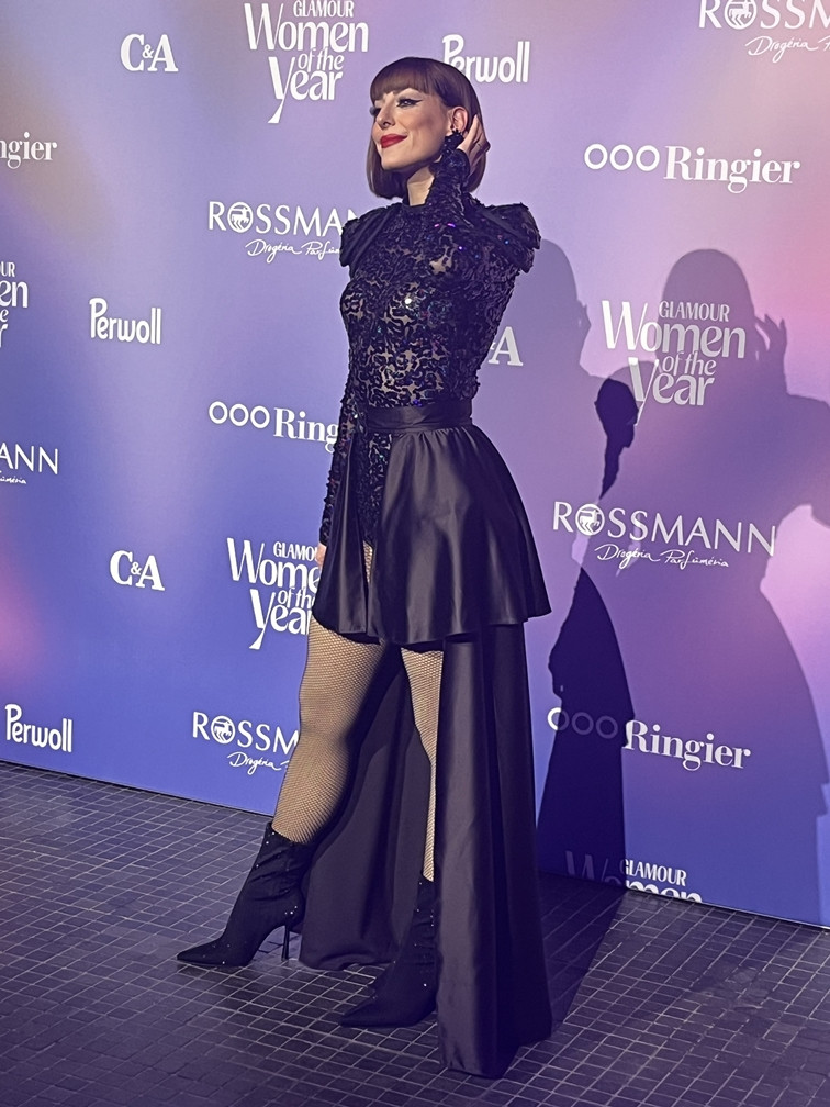 Horányi Juli színésznő és énekesnő ezt a meseszép, csipkés fekete bodyt párosította egy különleges szabású szoknyával.