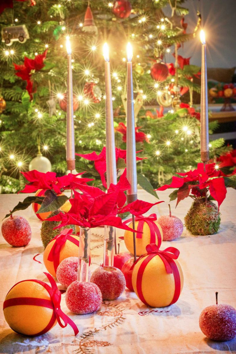 A gyertyatartó elkészítéséhez először óvatosan vegyük ki a mini mikulásvirágot a cserépből, fedjük be a gyökérlabdát mohával és rögzítsük a kézműves dróttal. Tipp: mindenekelőtt öntözzük meg a növényt, hogy a gyökérlabda nedves legyen. Utolsó lépésként tegyük rá a mohával befedett gyökérlabdára a tüskés gyertyatartót.Tekerjük a piros díszszalagot a narancs köré, kössünk masnit a tetejére és rögzítsük a gyümölcsaljára a gombostű segítségével. Végül rendezzük el az asztalon a házi készítésű mikulásvirágtartót és gyertyatartót egyéb díszekkel kombinálva, például naranccsal és almával.