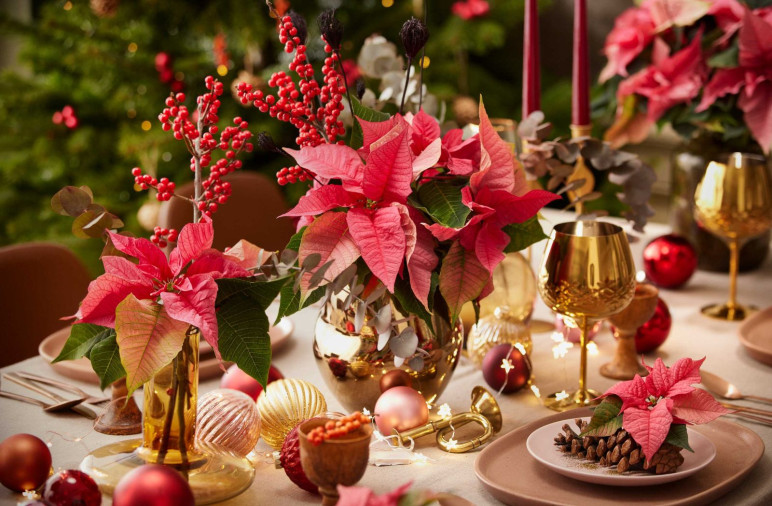 Annak érdekében, hogy az ünnepi asztal teljes fényében tündökölhessen, érdemes elhelyeznünk néhány rózsaszín vágott mikulásvirágot. Az aranyszínű vázák és poharak, a csillogó karácsonyi díszgömbök, a gyertyák és a fényfüzérek tökéletesen kiegészítik a virágunk színeit. A mikulásvirágot kiegészíthetjük mocsári magyallal és eukaliptusz levelekkel, sőt, vendégeink tányérára is nyugodtan helyezzünk további vágott szárakat.