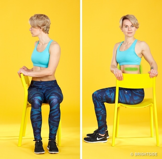 Hogyan csináld? Ülj le a székre úgy, hogy a háttámlája az oldaladnál legyen. Ha ez megvan, fordulj a felsőtesteddel (de ne a csípőddel) a támla felé, fogd is meg a kezeddel. Tartsd meg 30 mp-ig a pózt, érezd, ahogy feszülnek a háti és az oldalsó izmok. Térj vissza a kiinduló helyzetbe. Csináld meg ötször a gyakorlatot.