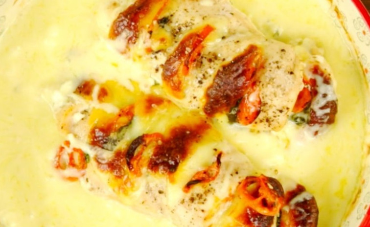 Mozzarellával, paradicsommal töltött csirkemell, tejfölágyon