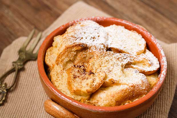 Egy közepes jénai tálat kikenünk vajjal és megszórjuk zsemlemorzsával. A tojásokat a cukorral, vaníliás cukorral kikeverjük, hozzáadjuk a tejet. Ebben a keverékben megforgatjuk a három-négy szeletbe vágott zsemléket. Sorban szorosan egymás mellé lerakjuk a tál aljára, majd elkezdjük rétegezni. Mindezt addig folytatjuk, míg a zsemle el nem fogy. Az utolsó sor tetejére három vékony szelet vajat teszünk. Előmelegített sütőben, kb.180 fokon pirosra sütjük. Ha megsült, késsel körbevágjuk, hogy elváljon az edény falától. Egy nagy süteményes tányérra borítjuk és vaníliás cukorral összekevert porcukorral meghintjük.