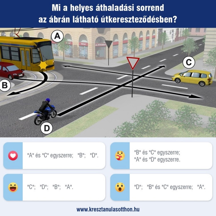 Két autó, egy motor és egy villamos: milyen sorrendben haladnak át a járművek a kereszteződésben?