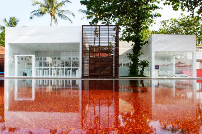 Egészen különleges hatása van ennek a vörös csempével kirakott medencének. Háttérben egy hatalmas könyvtár - akár a vízben is olvasgathatsz.