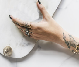 Az indiai nők hennás kézdíszítési hagyományait idézi a formabontó ékszer, a karkötővel egybekötött gyűrű.